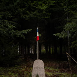 Après environ 3km, vous arriverez à la stèle commémorative du maquis des Fiottes. En juillet 1943, le résistant Joseph Pelletier, co-fondateur du maquis Bernard (Ouroux-en-Morvan) cacha dans ces bois quatre réfractaires au S.T.O. (Service du Travail Obligatoire). Après quelques déplacements dans les bois alentours, le maquis retrouve ce lieu le 14 février 1944. Le lendemain, une équipe de collaborateurs parvient à trouver le campement et tue les cinq maquisards.